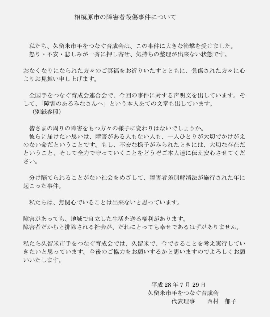 神奈川県相模原市にある障害者施設での殺傷事件を受けて、「久留米市手をつなぐ育成会」がメッセージを発表しました。『障害があっても、地域で自立した生活を送る権利があります。障害者だからと排除される社会が、だれにとっても幸せであるはずがありません。私たちは、久留米で、今できることを考え実行していきたいと思っています』