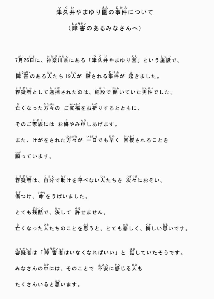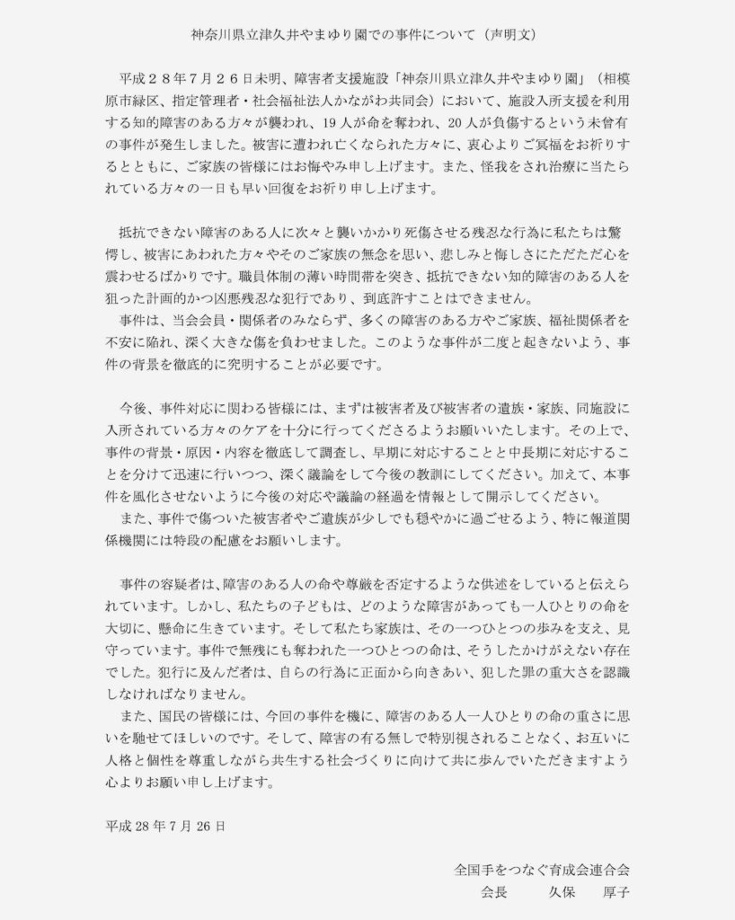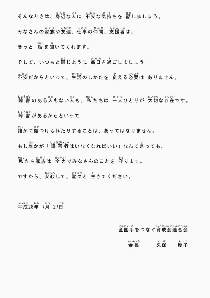 また、『全国手をつなぐ育成会連合会』が、ホームページで「声明文」と「障害のある人へのメッセージ」を発表しています。