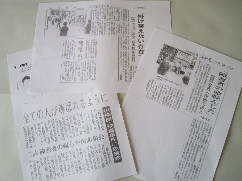 8月9日(火)、神奈川県相模原市にある障害者施設での殺傷事件を受けて、障害者に対する偏見をなくそうと、久留米市の障害者3団体による街頭リレートーク集会が行われました。