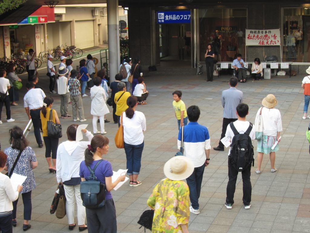 当日は、駅前に約100名が参加。障害者やご家族、支援者の皆さん、そして飛び入りの皆さんも含めて10数人がマイクを握り、「障害者の命を軽んじた事件」「一人ひとりがかけがえのない存在」など、力強く声を上げました。