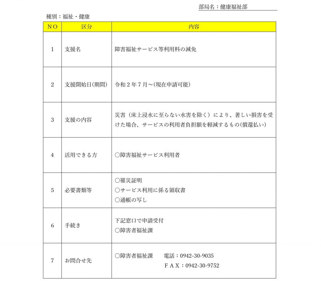 久留米市ホームページの「令和2年7月豪雨被災者支援情報 」において、「医療・福祉・健康」の「障害福祉サービスの減免」