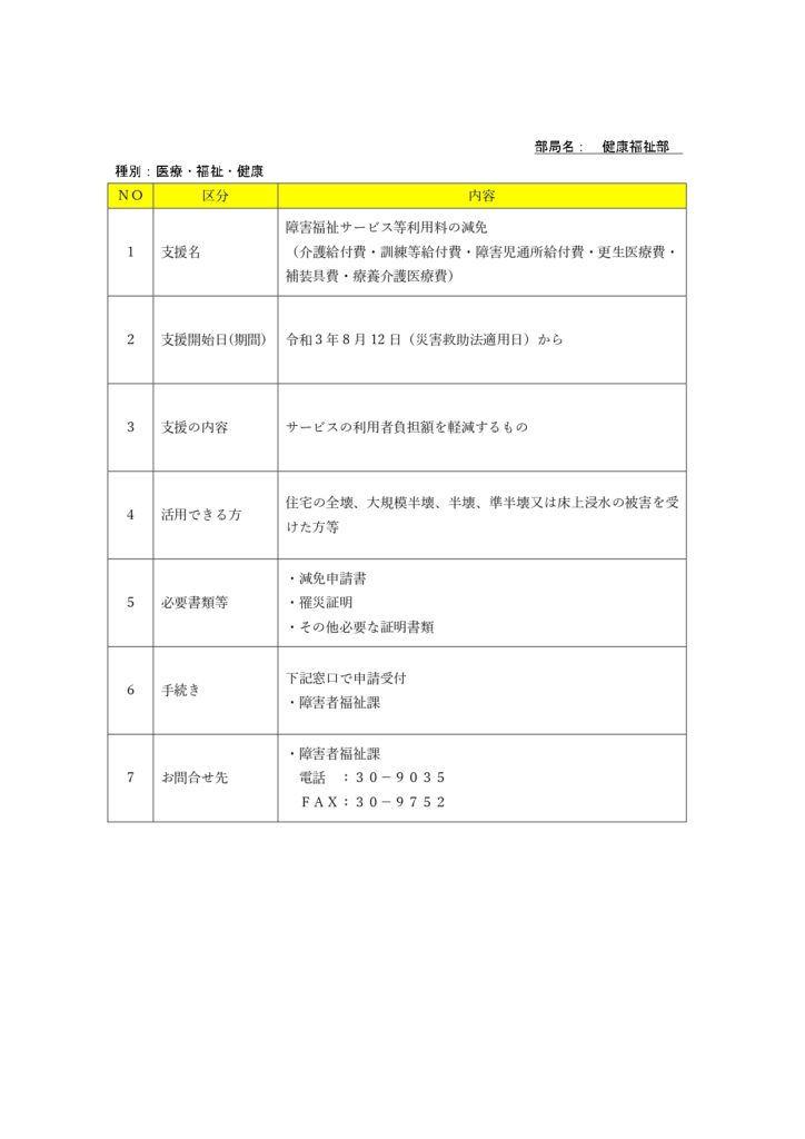 久留米市ホームページの「令和3年8月豪雨災害被災者支援」において、「医療・福祉・健康」の「障害福祉サービスの減免」