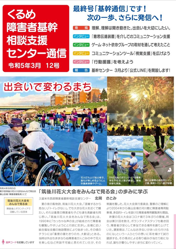 2023年3月発行の第12号最終号「基幹通信」を紹介します。「出会いで変わるまち」を特集として、「意思伝達装置を介してのコミュニケーション」「ゲーム・ネット依存グループの取材を通して考えたこと」「行動援護を考えよう」などを掲載しています。ぜひご覧ください。