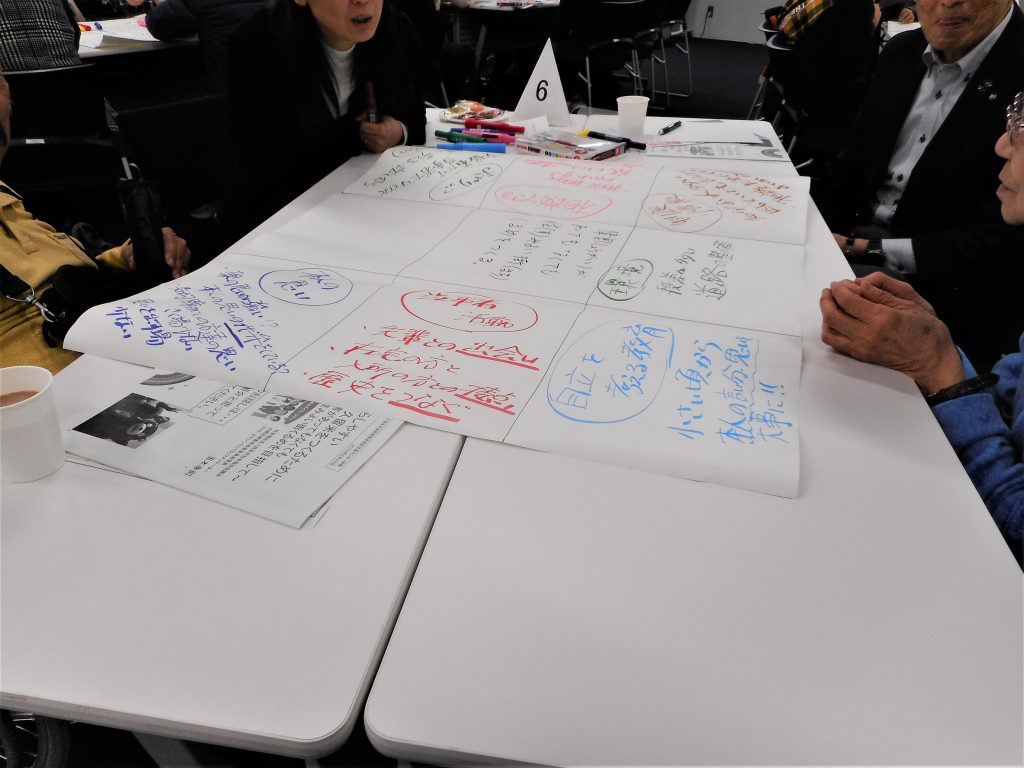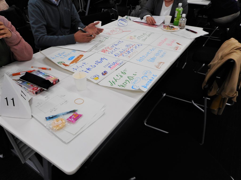 グループワークでは、障害があってもなくても住みよい街くるめを作るためには、どのような事・物・人・心が必要なのか、住みやすい街って…?について自由に話し合い、アイディアを出し合いました。
