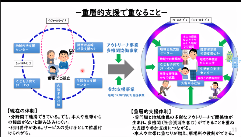 今回は令和3年度から始まった重層的支援体制整備事業と地域生活支援拠点事業についての説明を、久留米市担当者より行っていただきました。