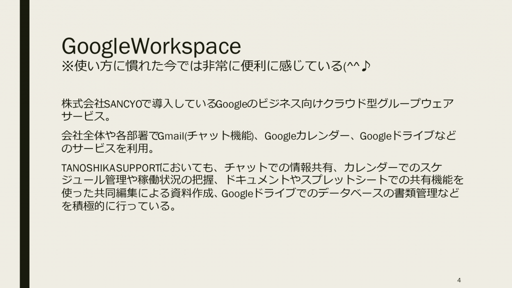 Google Work spaceを活用してのスケジュール管理や情報共有の実践は、一言で言うと「近未来的」。相談支援専門員の仕事は、限られた時間の中で、多くの情報共有やコミュニケーションのやり取りが必要ですが、「こんなやり方もあるんだ」と参考になりました。